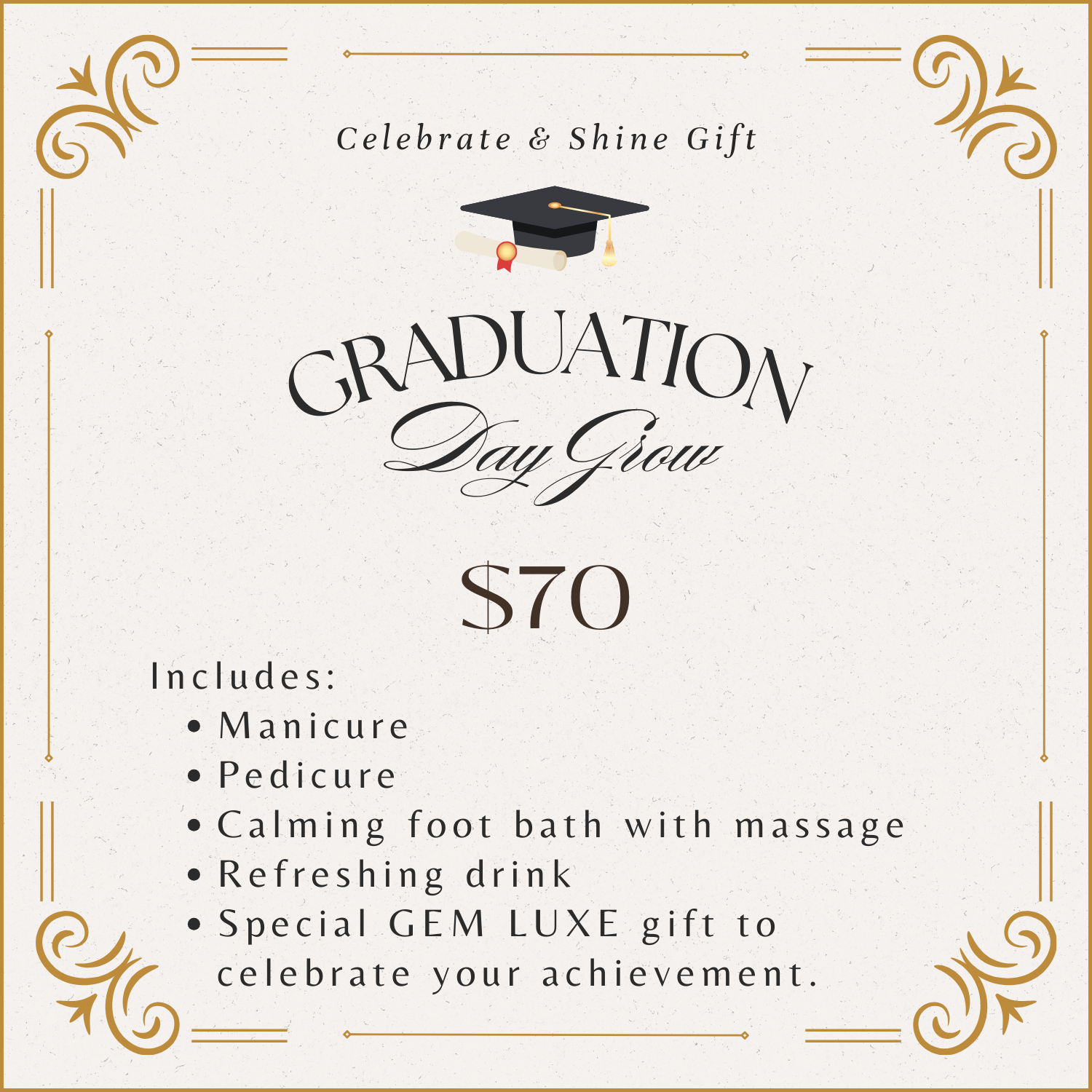 At GEM LUXE Nail Lounge, the experience always comes first. Our space is designed to feel calm, welcoming, and intentionally unhurried. Whether you visit us for everyday care or a special occasion, each appointment is approached with the same level of attention and care. We focus on creating a spa-like experience where you can relax, feel pampered, and enjoy time set aside just for you.